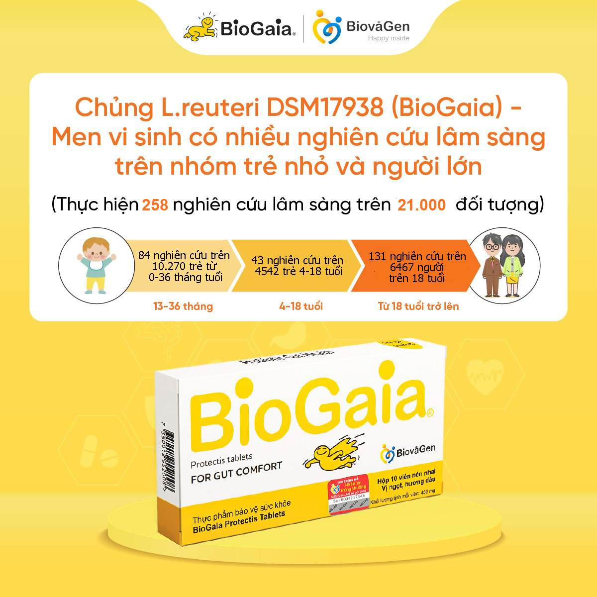 BioGaia vô cùng từ hào là đơn vị tiên phong, dẫn đầu thế giới về công tác nghiên cứu và sản xuất các sản phẩm men vi sinh chứa các chủng lợi khuẩn thuộc loài L.reuteri. Hiện nay, các sản phẩm bổ sung men vi sinh của BioGaia với loài vi khuẩn L.reuteri được nghiên cứu lâm sàng nhiều nhất trên thế giới.