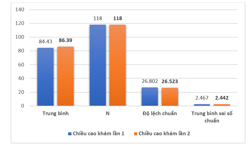 Sự khác biệt thống kê về chiều cao của những người tham gia đã được quan sát thấy ở lần khám thứ hai (p<0,001). Chiều cao trung bình trong lần khám đầu tiên là 84,43±26,8 cm và trong lần khám thứ hai là 86,39±26,5 cm